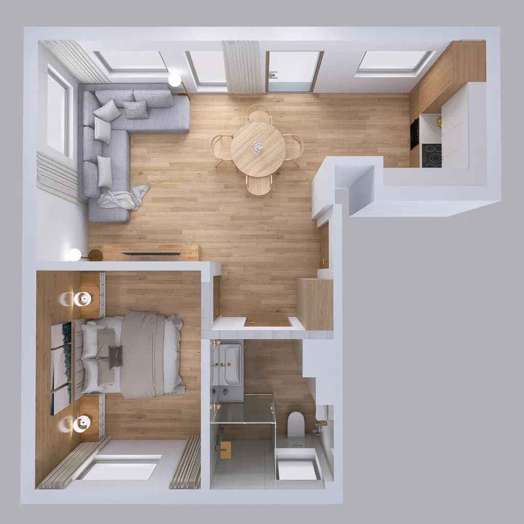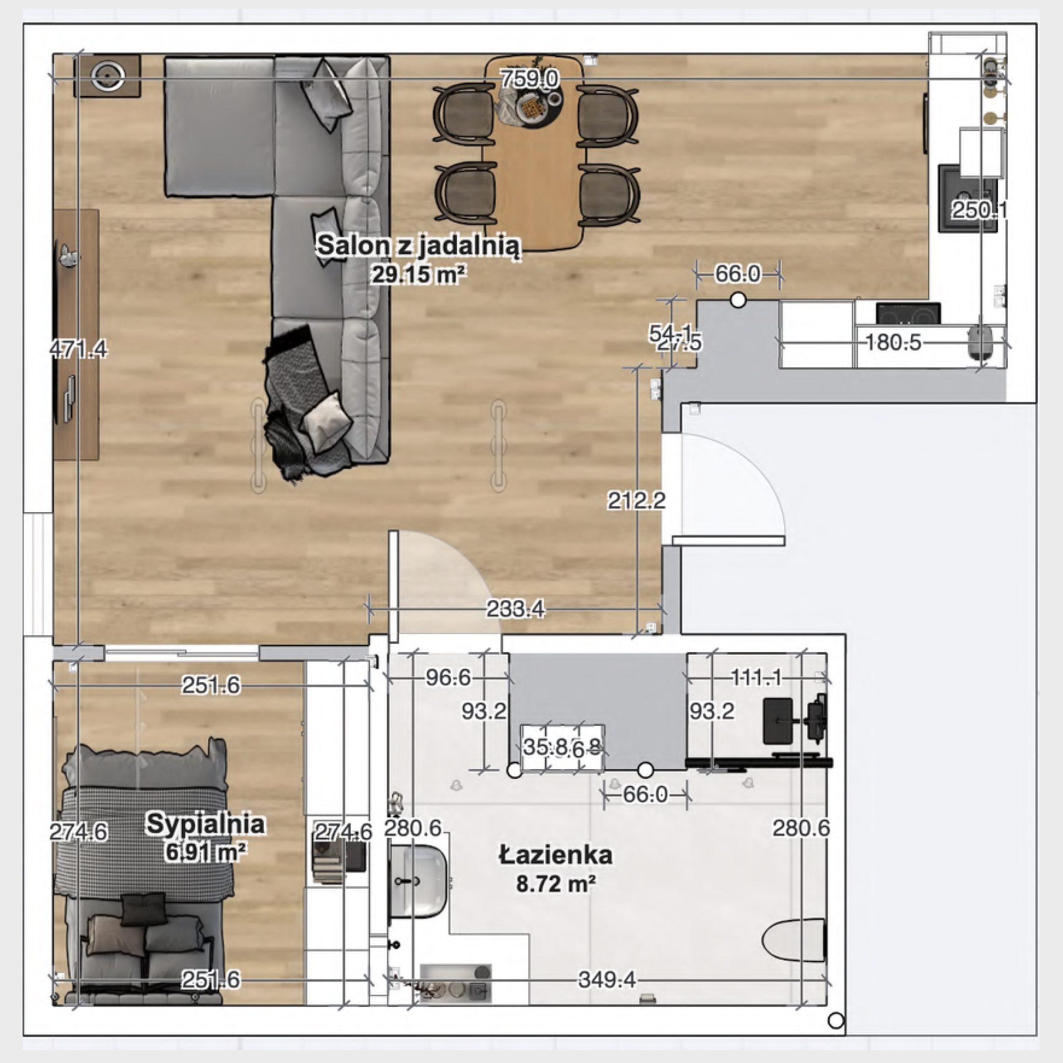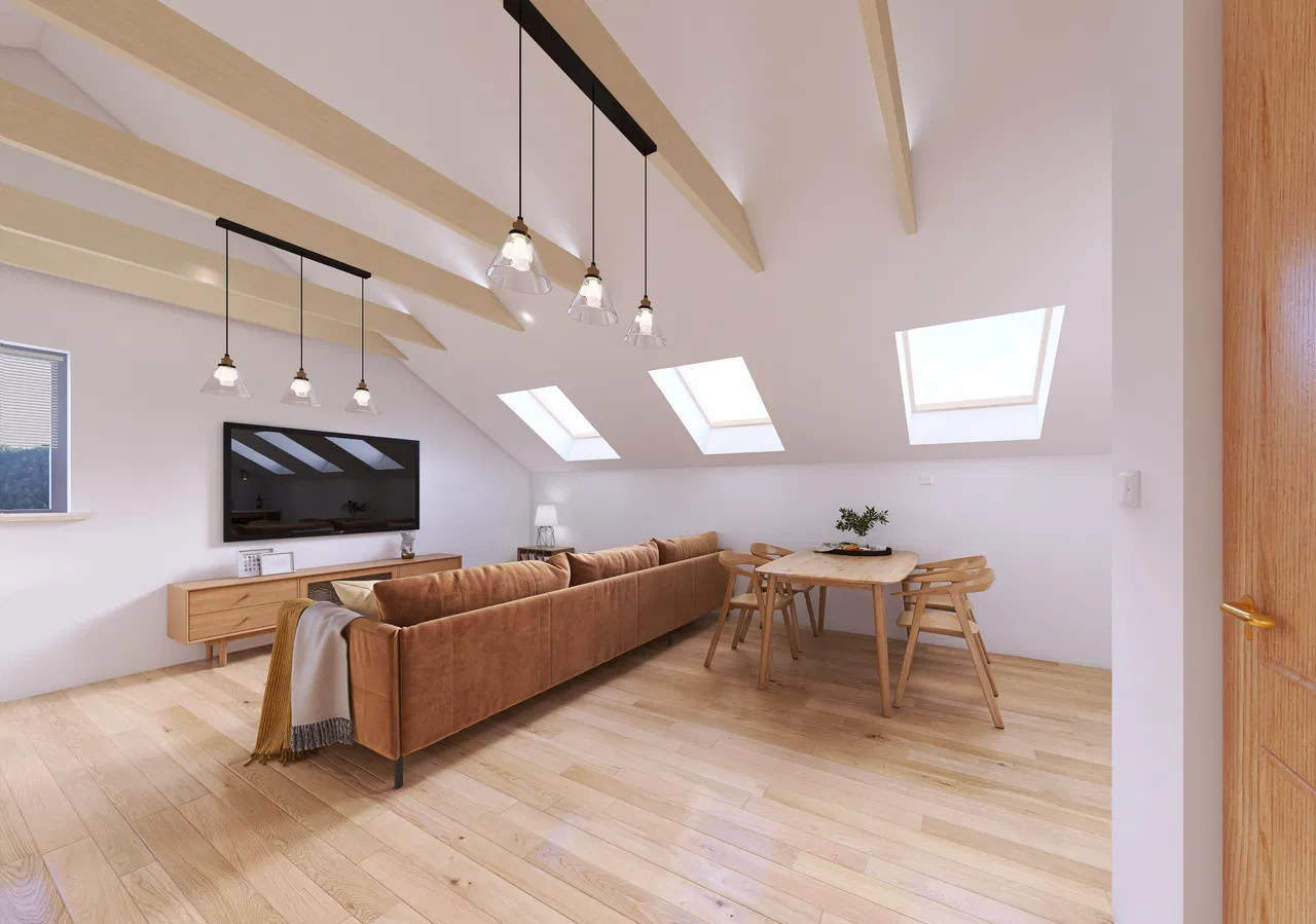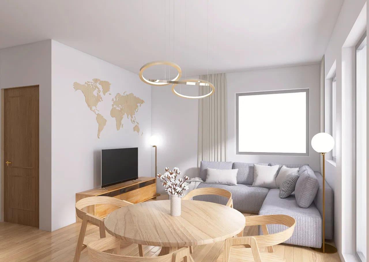 - przestronny salon z aneksem kuchennym
